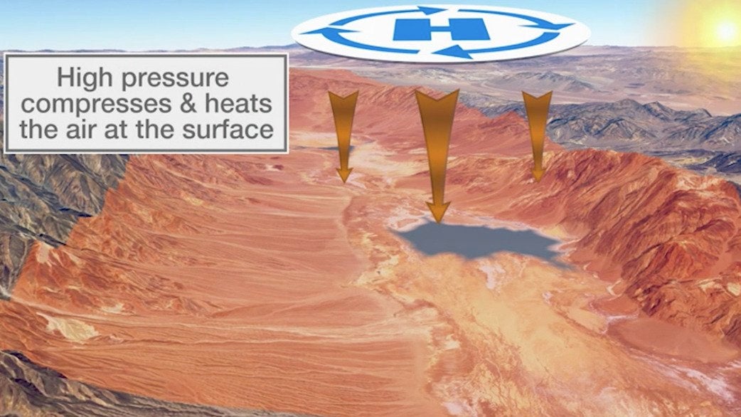 T​he valley is surrounded by mountains on all four sides, which also heat up in the desert sun. On a typical day, when the valley floor heats up, instead of mixing with cooler air from above, it mixes with still quite hot air just above it. In this way, heat can become trapped in the valley.
