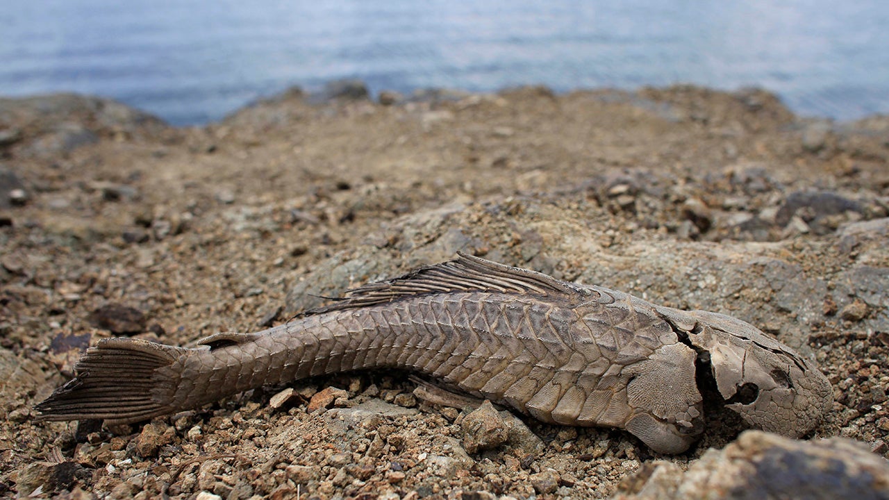 In this June 15, 2015 photo, a fish carcass litters the banks of the unusually low Carraizo reservoir in Trujillo Alto, Puerto Rico. (AP Photo/Ricardo Arduengo)
