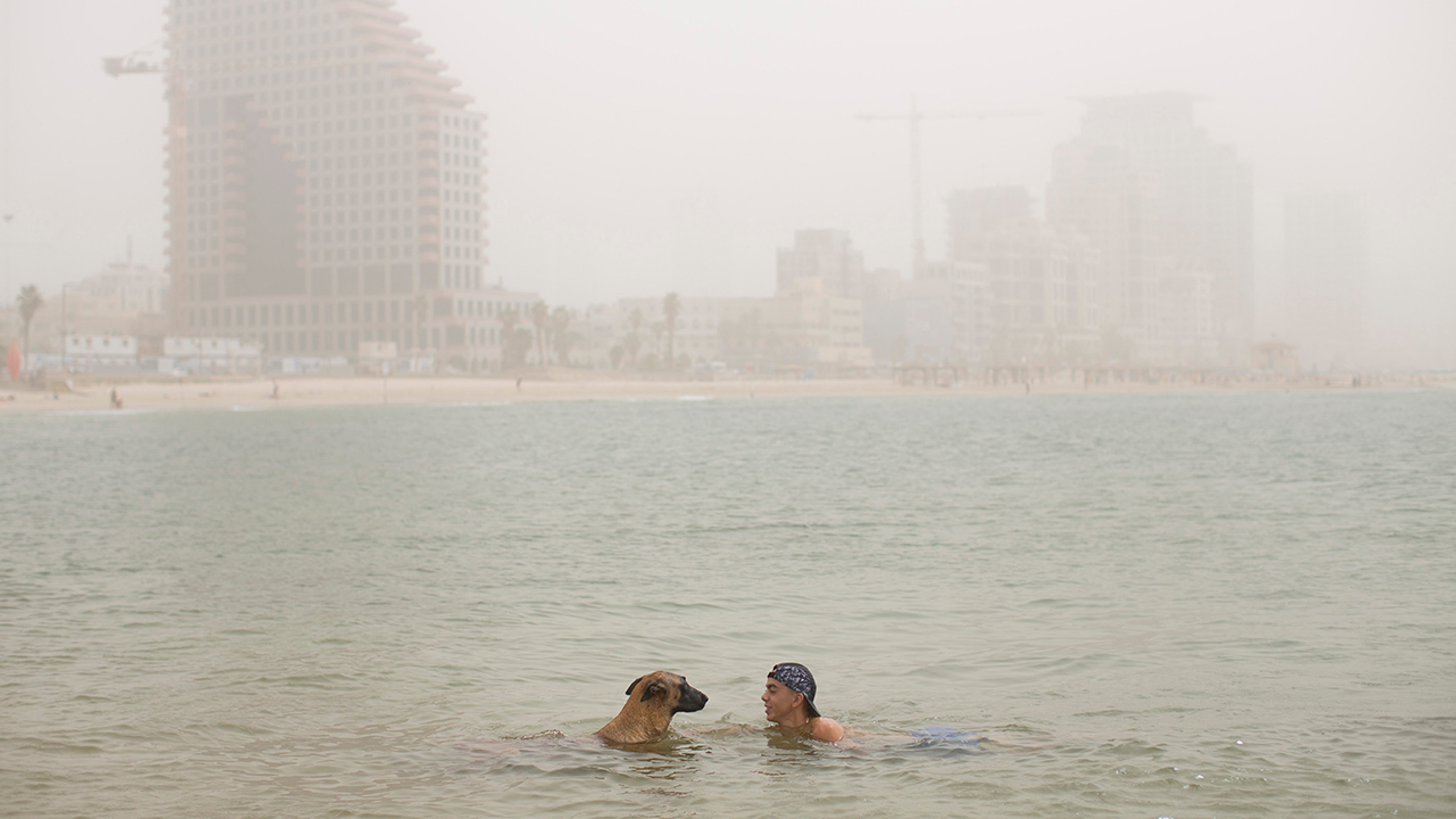 An Israeli man and his dog bath in the Mediterranean Sea along the beach front during a sandstorm in Tel Aviv, Israel, Wednesday, Sept. 9, 2015. (AP Photo/Oded Balilty)