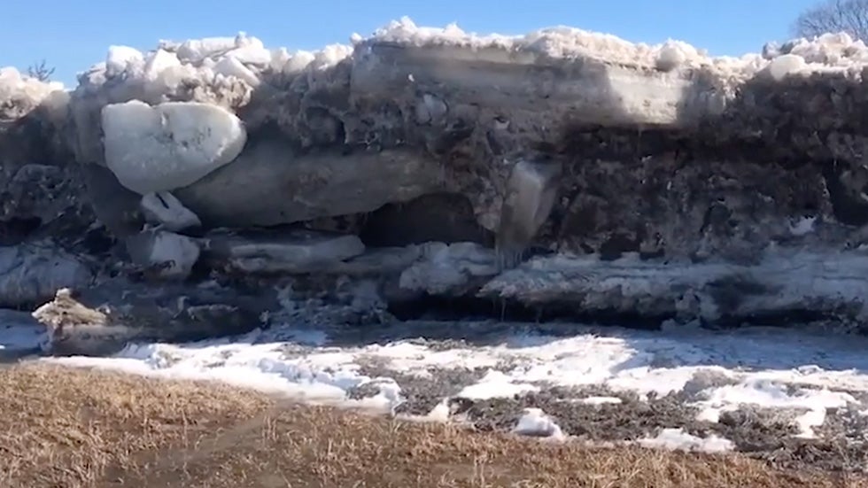 A video from March 16 shows a massive ice wall that appeared on a farm in Nebraska after flooding swept through the state.