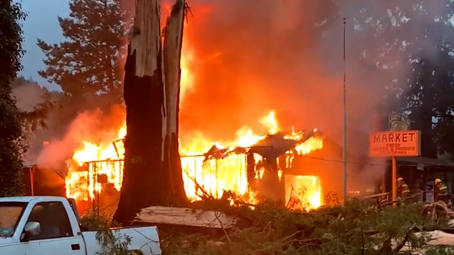 Witnesses say a lightning strike sparked an intense fire that destroyed a post office in Leggett, California.
