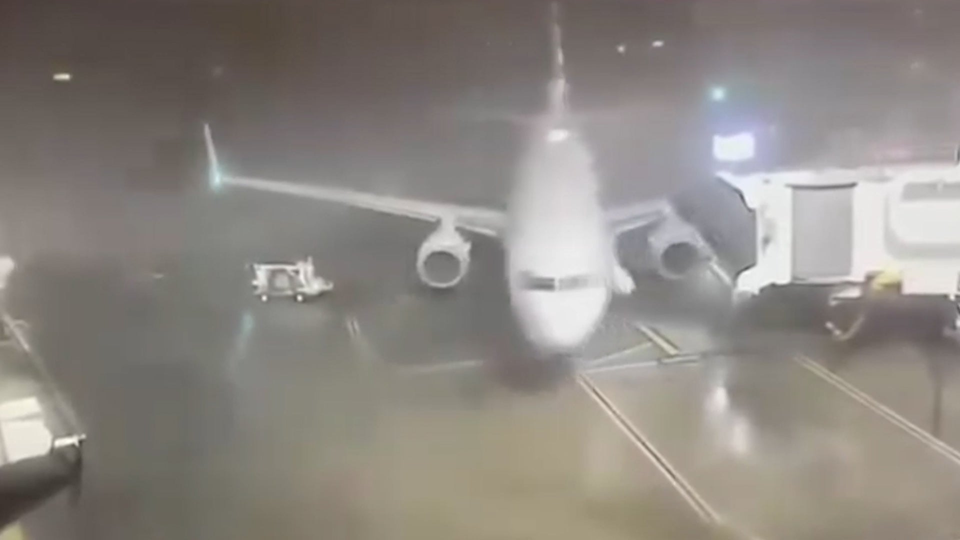 An American Airlines plane was no match for the heavy winds that walloped Dallas-Fort Worth Tuesday. See the moment those winds shoved the plane away from a boarding gate.