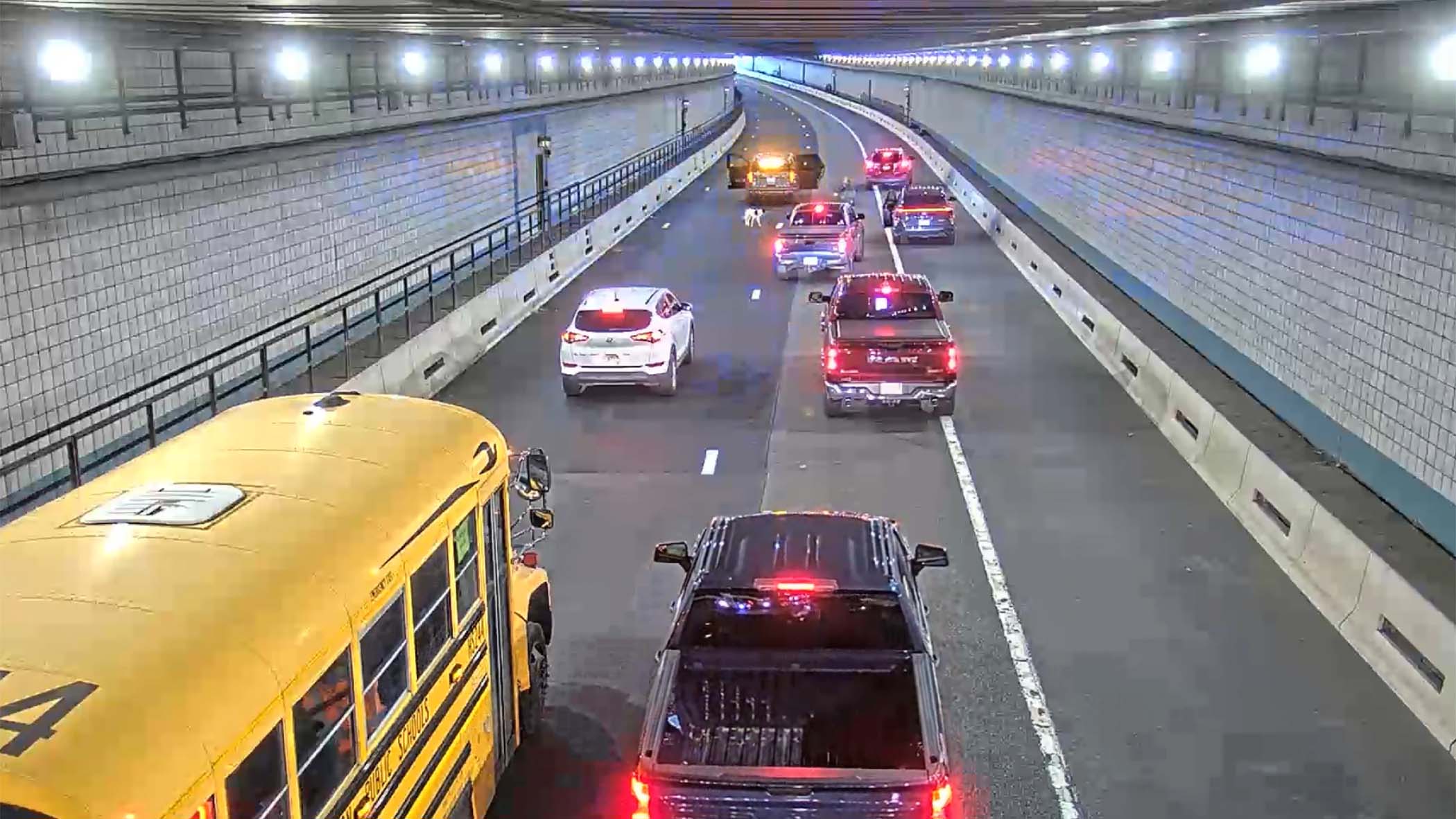 The black-and-white dog found itself racing against traffic in one of Boston's major tunnels.