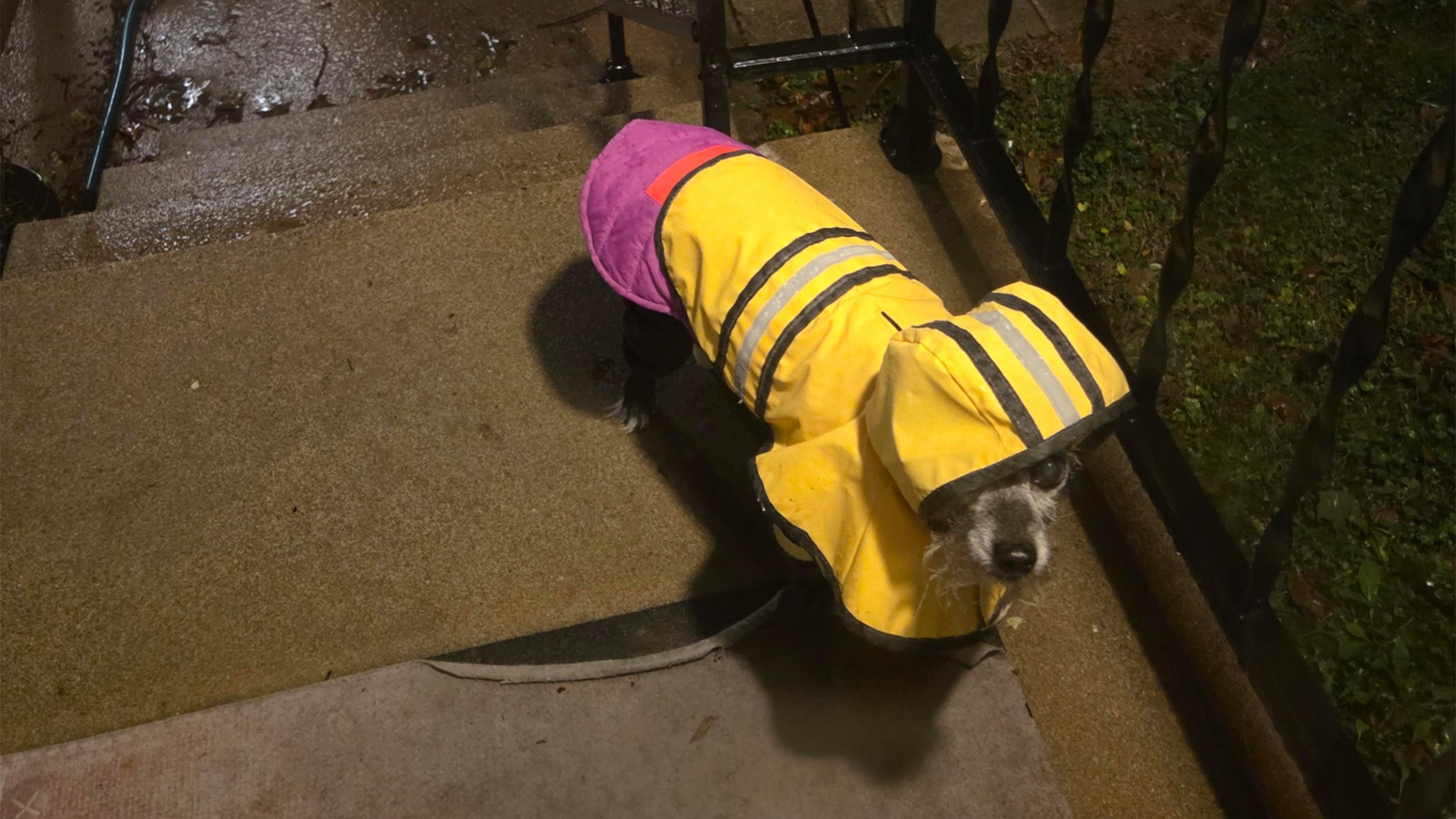 Perci is a 21-year-old rat terrier/chihuahua mix from Louisville, Kentucky. His owner writes, "He was an ambassador dog to my foster dogs. I fostered wallflower dogs for the Kentucky Humane Society. These dogs were terrified of humans. Some just scared for no reason, others abused or neglected. Perci would cuddle and play with them, also helping to show how Perci and I reacted with each other. Eventually they would learn to trust me and I could work with them to become available for adoption. He retired 6 years ago but still gets to visit and play with a couple of old fosters. He doesn't like stormy weather. Definitely prefers sun and clear skies so he can lay and bask in the sun's rays, but will make an exception for rain as long as he is wearing his raincoat. He much prefers to cuddle in my lap under a blanket."