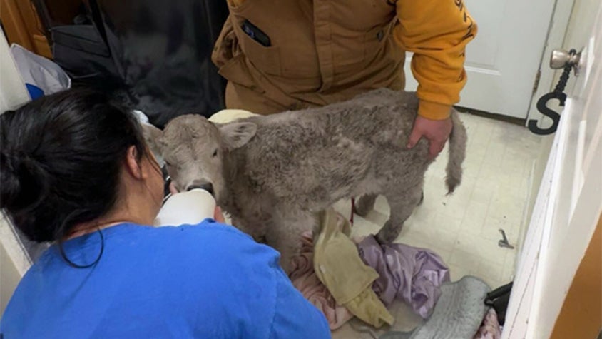 The calf was born outdoors in single-digit temperatures on Saturday. Macey Sorrell said her husband, Tanner, went outside to check on the pregnant mother and found the calf, suffering in the cold.