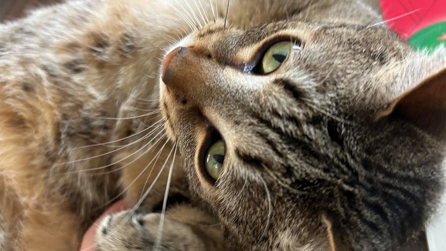 Say hello to Mango! This 3-year-old tabby hails from Michigan. As his owner writes, "He’s super silly, he loves to play with hairbands. And he gets the zoomies a lot! He gets so crazy he runs into the wall 🤣. He is super sweet and lovey too!"