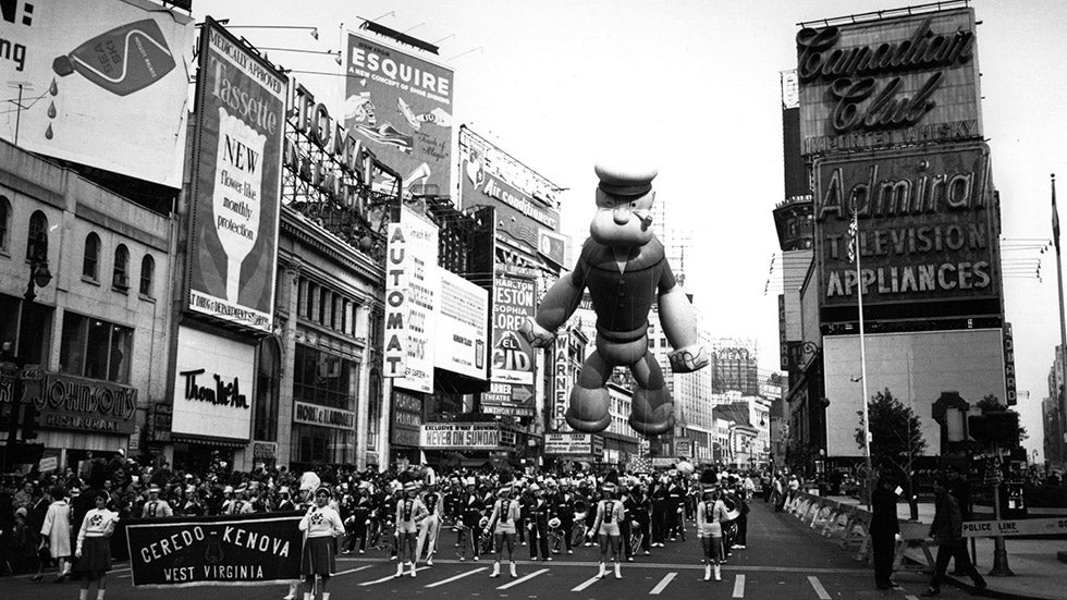 November 1961: A Thanksgiving parade in New York. Floating above the majorettes is a giant inflatable Popeye. (Express Newspapers/Getty Images)