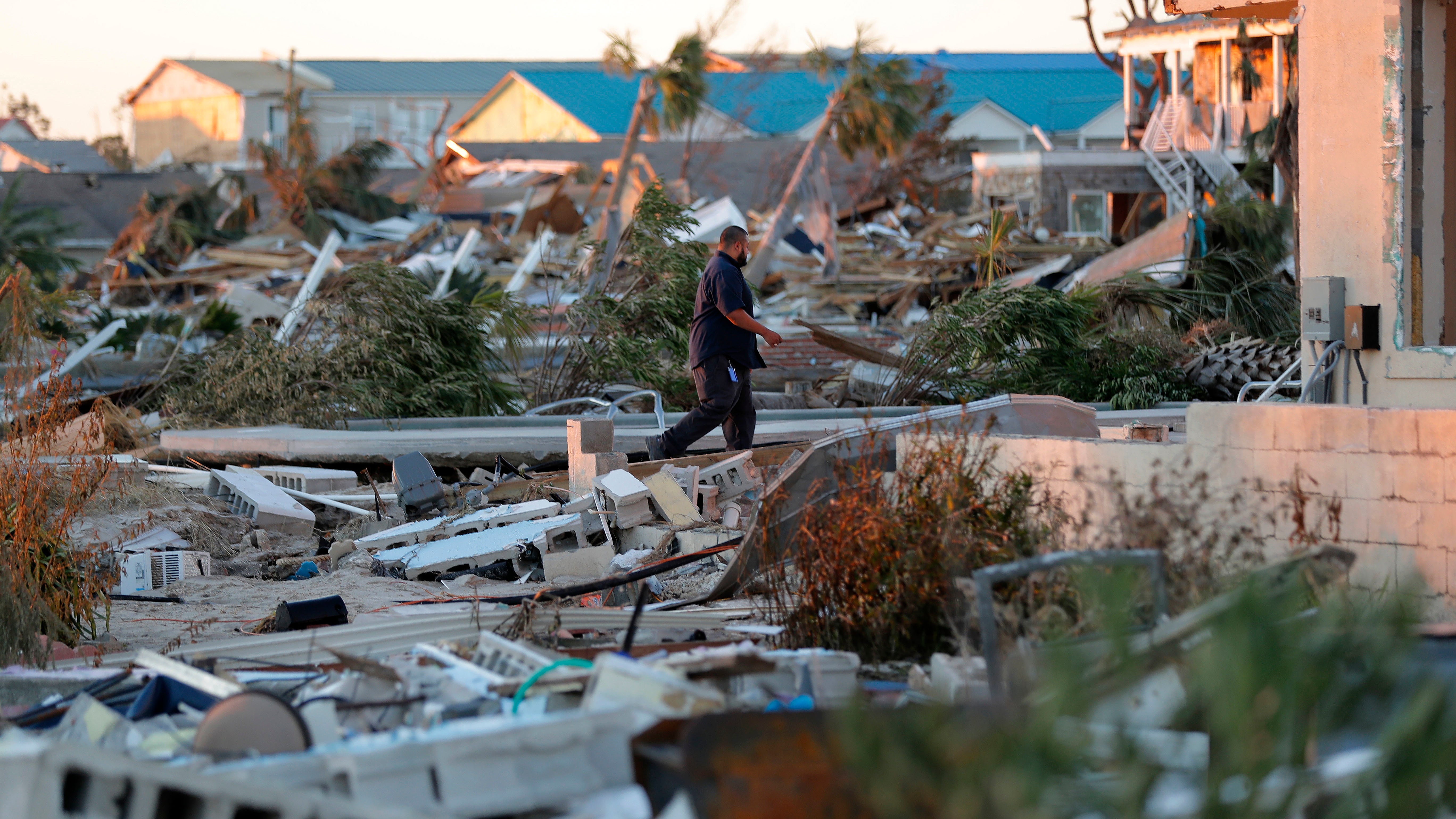 Henry Penafiel, a member of the FEMA emergency response, walks amid ruin in the aftermath of Hurricane Michael in Mexico Beach, Fla., Saturday, Oct. 13, 2018. (AP Photo/Gerald Herbert)