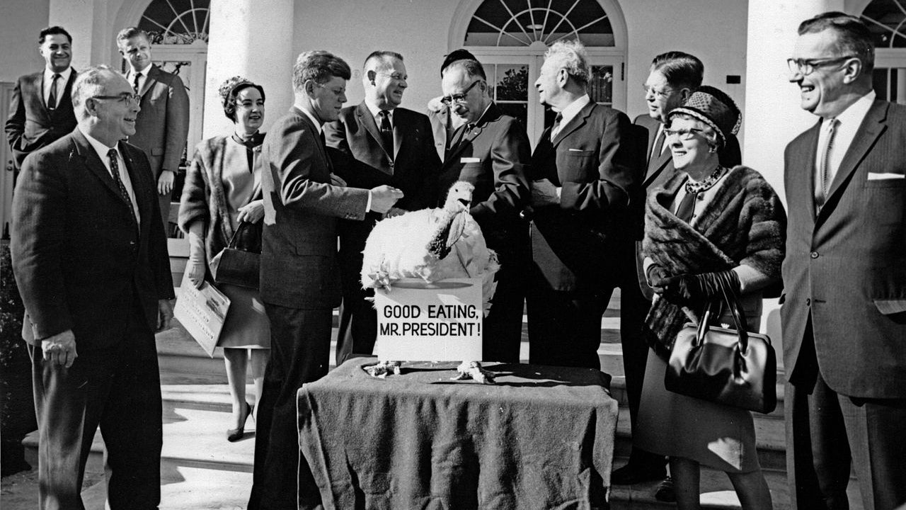 US President John F. Kennedy receives the annual White House Thanksgiving turkey from the National Turkey Federation, just three days before his assassination in Dallas. (National Archives and Records Administration)