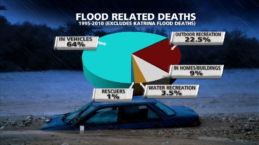 Almost two out of every three U.S. flash flood deaths from 1995 to 2010, excluding fatalities from Hurricane Katrina, occurred in vehicles, according to Dr. Greg Forbes, former severe weather expert at The Weather Channel.