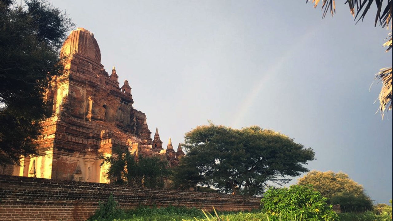 This photo provided by David Greco/@daveinosaka, shows a rainbow on a temple in Bagan, Myanmar, on Wednesday, Aug. 24, 2016. A powerful earthquake measuring a magnitude 6.8 shook central Myanmar on Wednesday, damaging scores of ancient Buddhist pagodas in the former capital of Bagan, a major tourist attraction, officials said. (David Greco/@daveinosaka via AP)