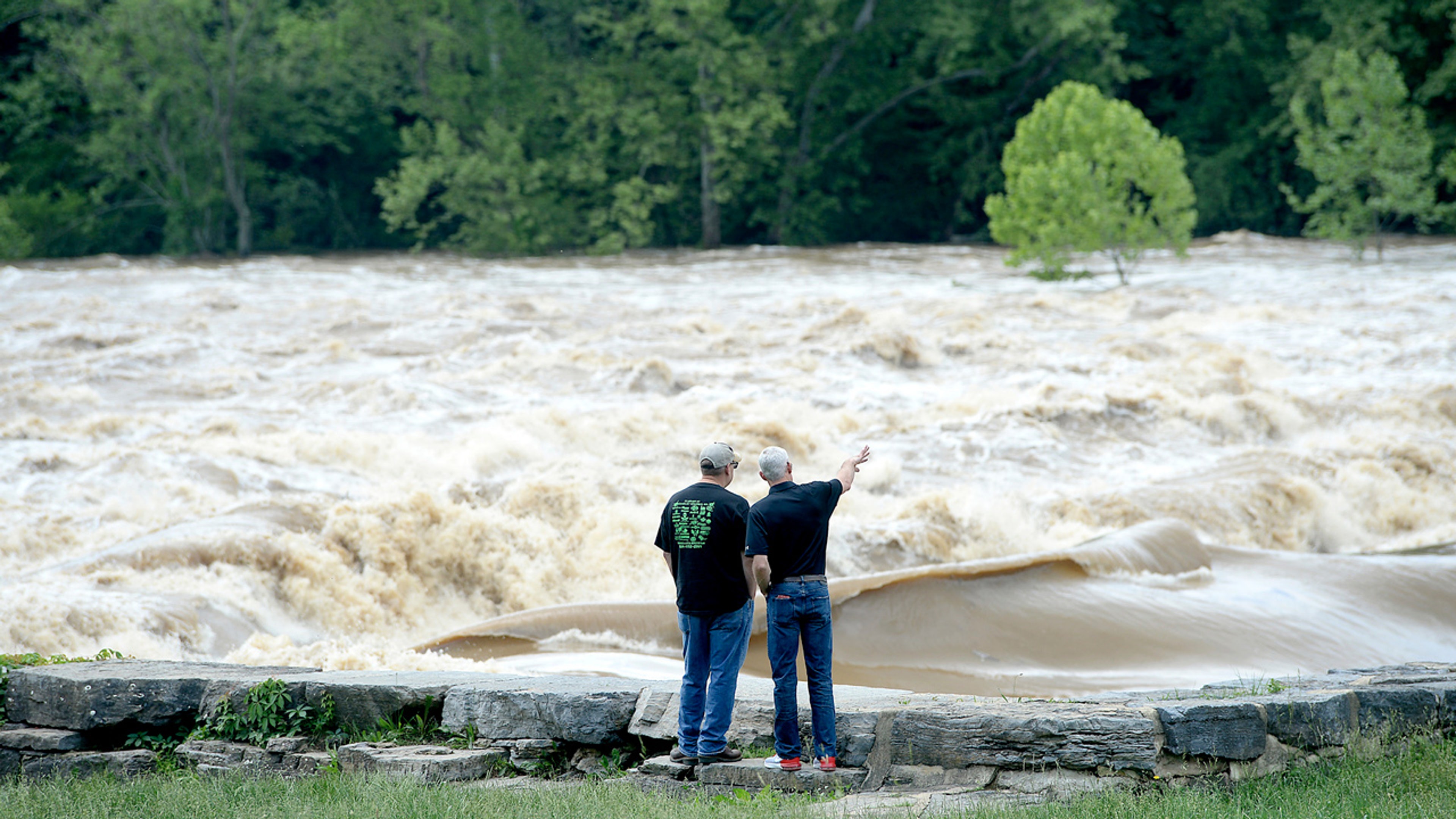 Craig Werner, left, and Andy Lee watch as turbulent floodwaters flow by on the Potomac River at Dam Number 5 at the C and O Canal National Historic Park in Clear Spring, Maryland, Monday, June 4, 2018.