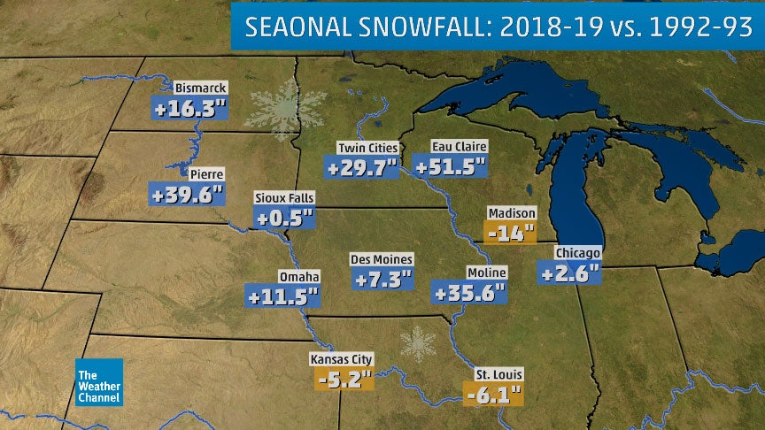 Plotted above is the difference in seasonal snowfall (in inches) in 2018-19 compared to 1992-93, prior to the Midwest flood of 1993. A positive/negative value indicated 2018-19 picked up more/less snowfall than 1992-93.