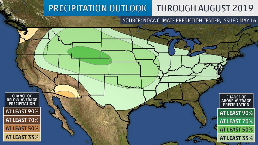 Precipitation outlook through August, issued by NOAA's Climate Prediction Center on May 16, 2019. Darker green/brown contours indicate increasing chances of above/below-average precipitation during that time.