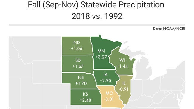 Kansas, Iowa, Wisconsin and Illinois had wet September-November periods both in 2018 and 1992, but owa had its third-wettest Fall on record in 2018.