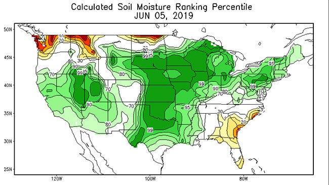 An expansive area of the Midwest and Plains are in the 99th percentile for soil moisture relative to early-June averages, according to an analysis by NOAA's Climate Prediction Center.