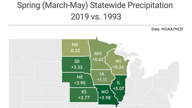 The beat continued into spring, again among the top 10 wettest on record for almost every Midwestern state and much wetter than spring 1993, particularly in an arc from South Dakota to Kansas to Missouri and Illinois.