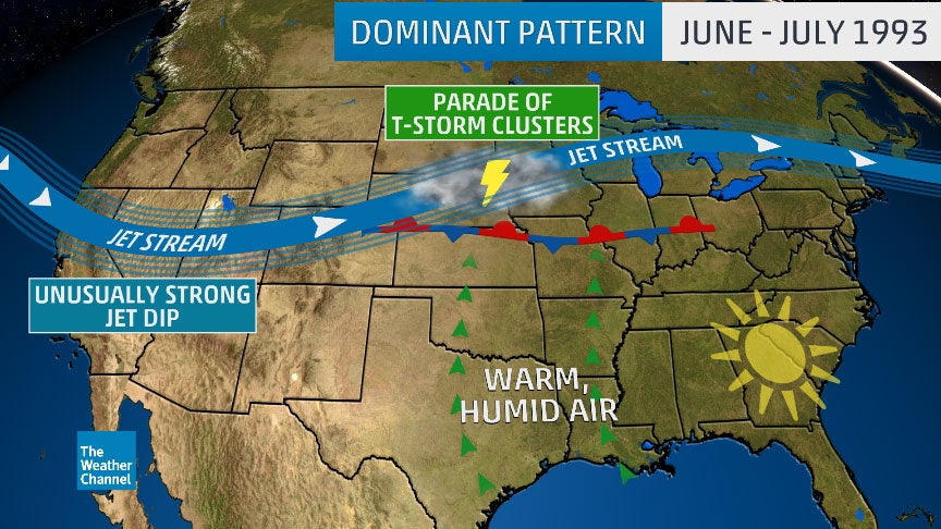 The dominant weather pattern triggering the Midwest flood of 1993 included an unusually strong, persistent jet-stream dip over the West and a waffling frontal boundary in the nation's midsection, igniting clusters of thunderstorms in the Plains and Midwest.