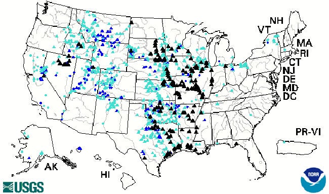 This map shows river and stream gauges above flood stage (black triangles), those in the 99th percentile for streamflow (in blue) and those at least in the 95th percentile (in teal) on June 7, 2019.