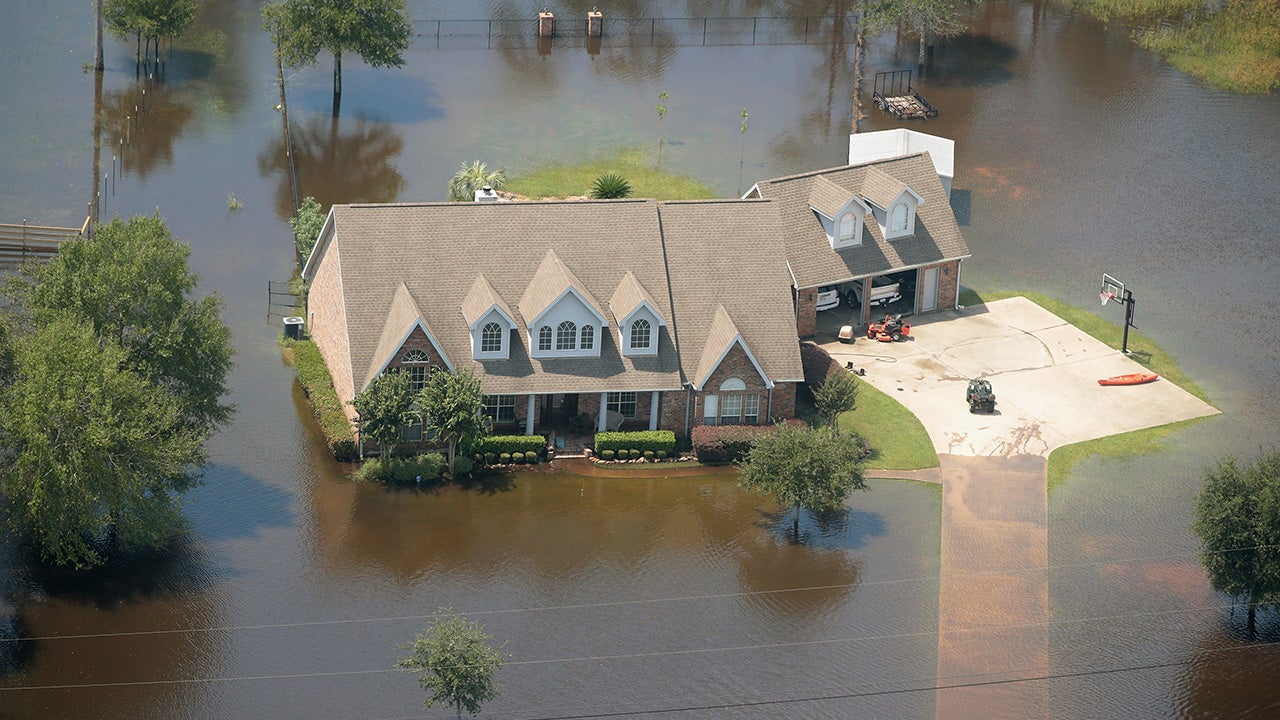 A home is surrounded by floodwater after torrential rains pounded Southeast Texas following Hurricane and Tropical Storm Harvey on Aug. 31, 2017 near Orange, Texas.