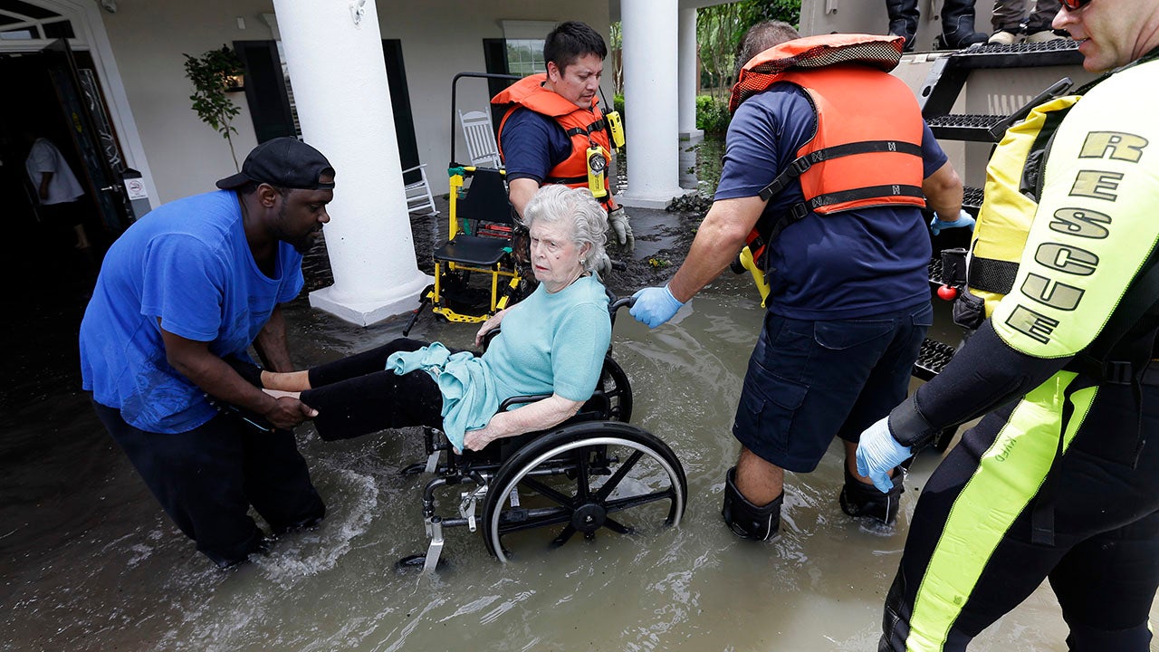 A resident of a retirement and assisted living complex is helped by rescue personnel as the facility is evacuated due to rising floodwaters Tuesday, April 19, 2016, in Spring, Texas. Storms have dumped more than a foot of rain in the Houston area, flooding dozens of neighborhoods. (AP Photo/David J. Phillip)