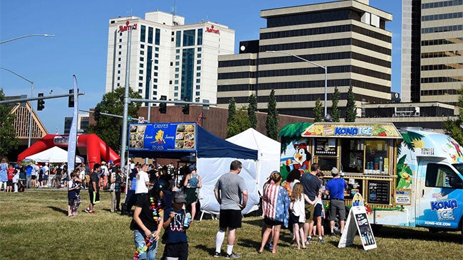 People wait in line for ice drinks at Delaney Park in Anchorage, Alaska, on July 4, 2019.