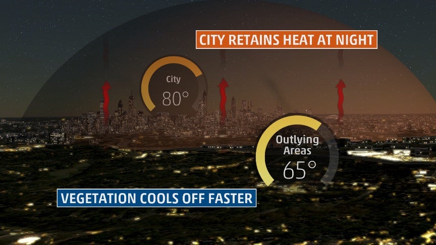 Dark buildings and pavement help to create a heat bubble, which allows the heat to be retained more at night, compared to rural areas where vegetation cools faster.