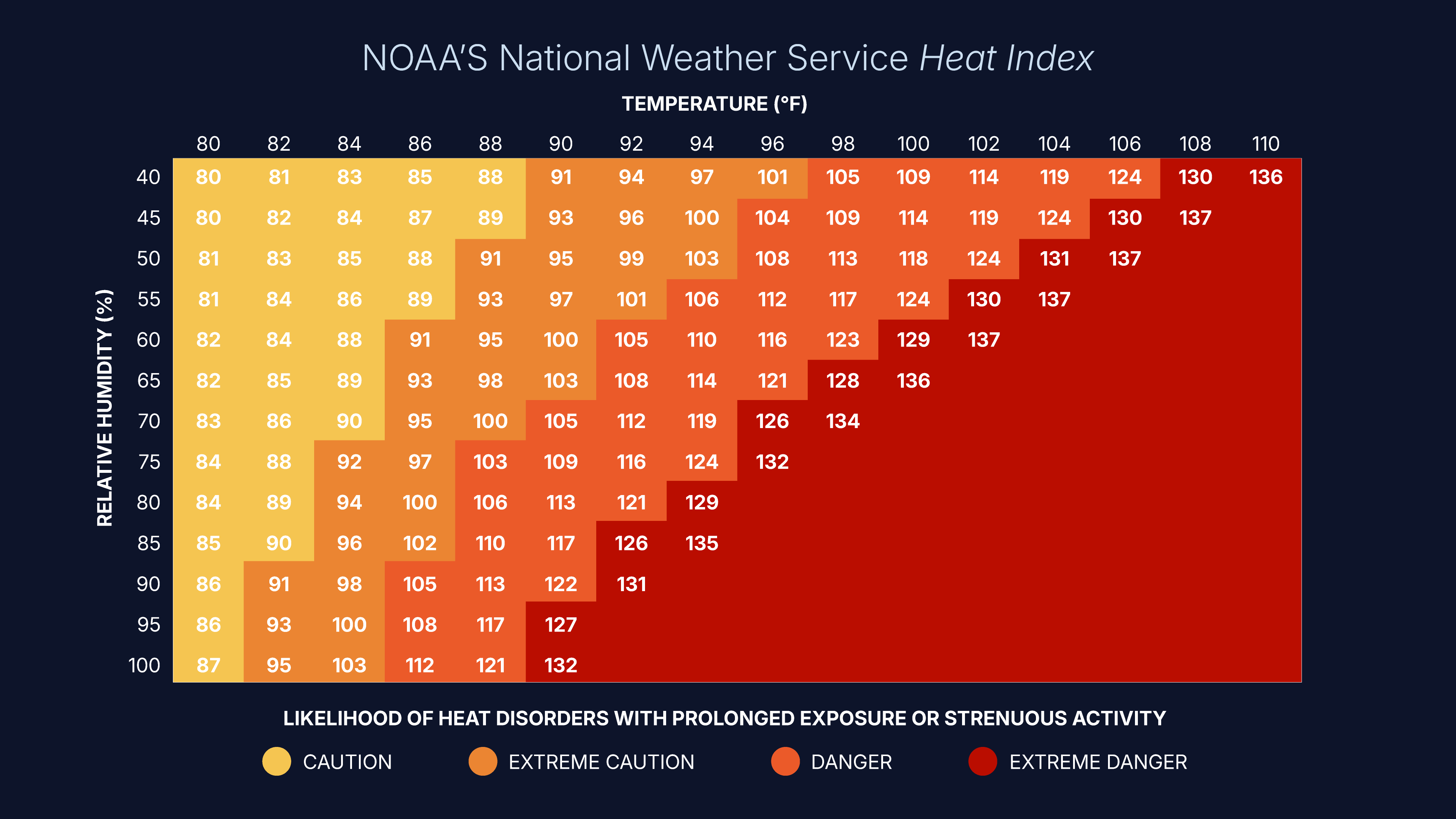 As shown in the chart below, when the heat index reaches 103 degrees or higher, conditions become dangerous.