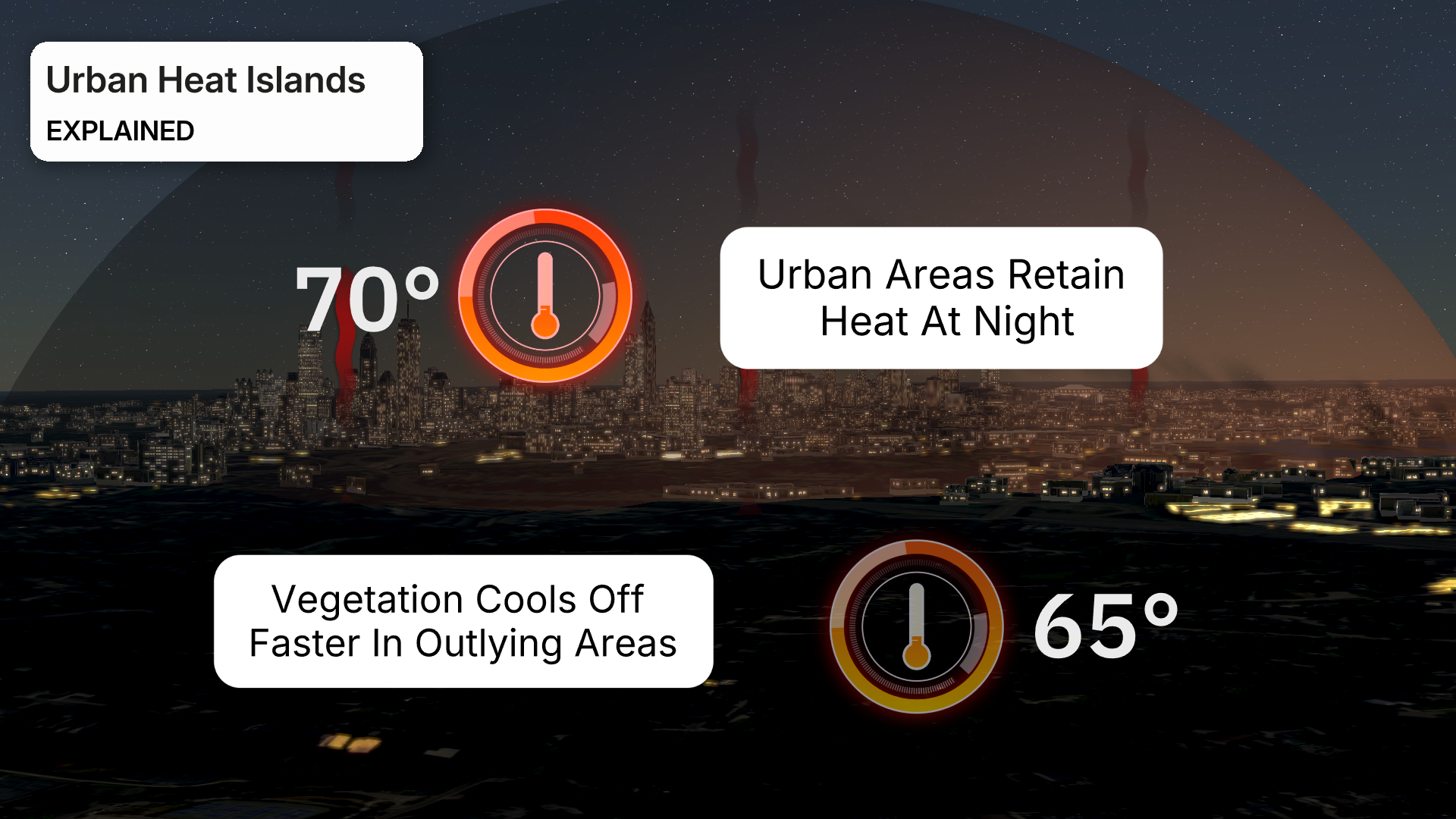 This temperature difference is because in cities, vegetation is replaced by pavement and dark buildings. The asphalt and concrete absorb the sun's heat, causing surface temperatures to rise. The taller buildings and narrow streets also reduce air flow and trap heat.