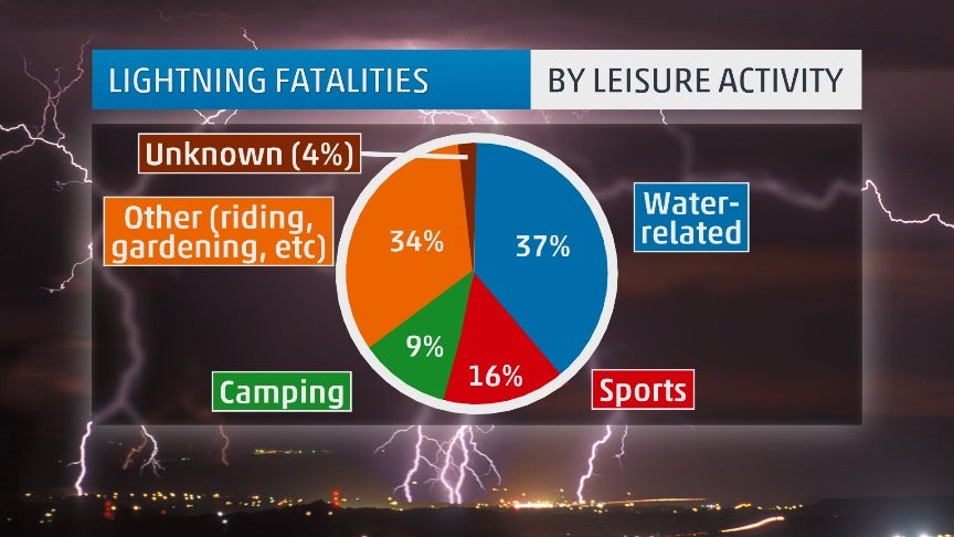 A study by the National Weather Service looked at lightning deaths from 2006-2014. It concluded 64 percent of deaths from lightning happened during leisure activities. The chart above breaks down those leisure activities, with 37 percent being water-related.