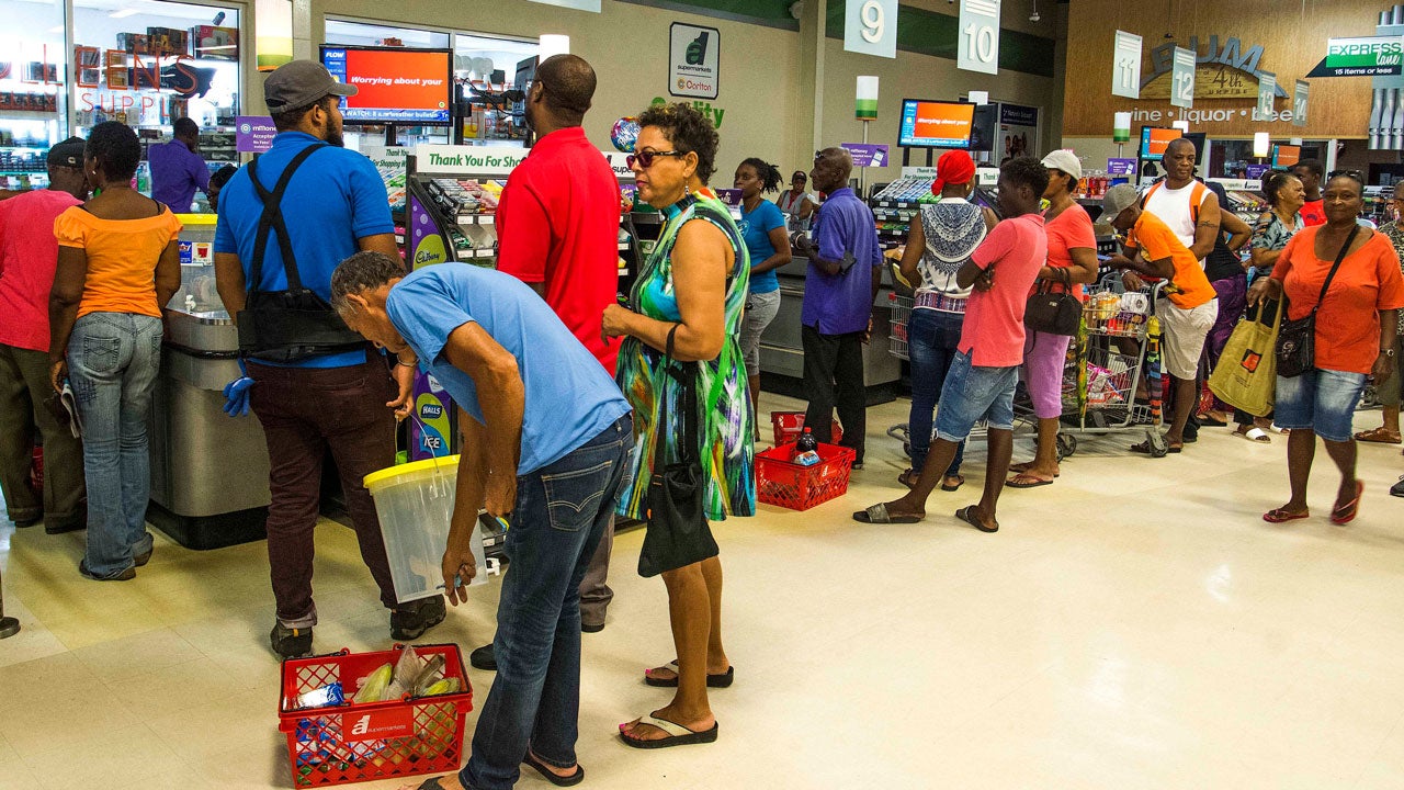 Residents stand in line at a grocery store as they prepare for the arrival of Tropical Storm Dorian in Bridgetown, Barbados, Monday, Aug. 26, 2019.