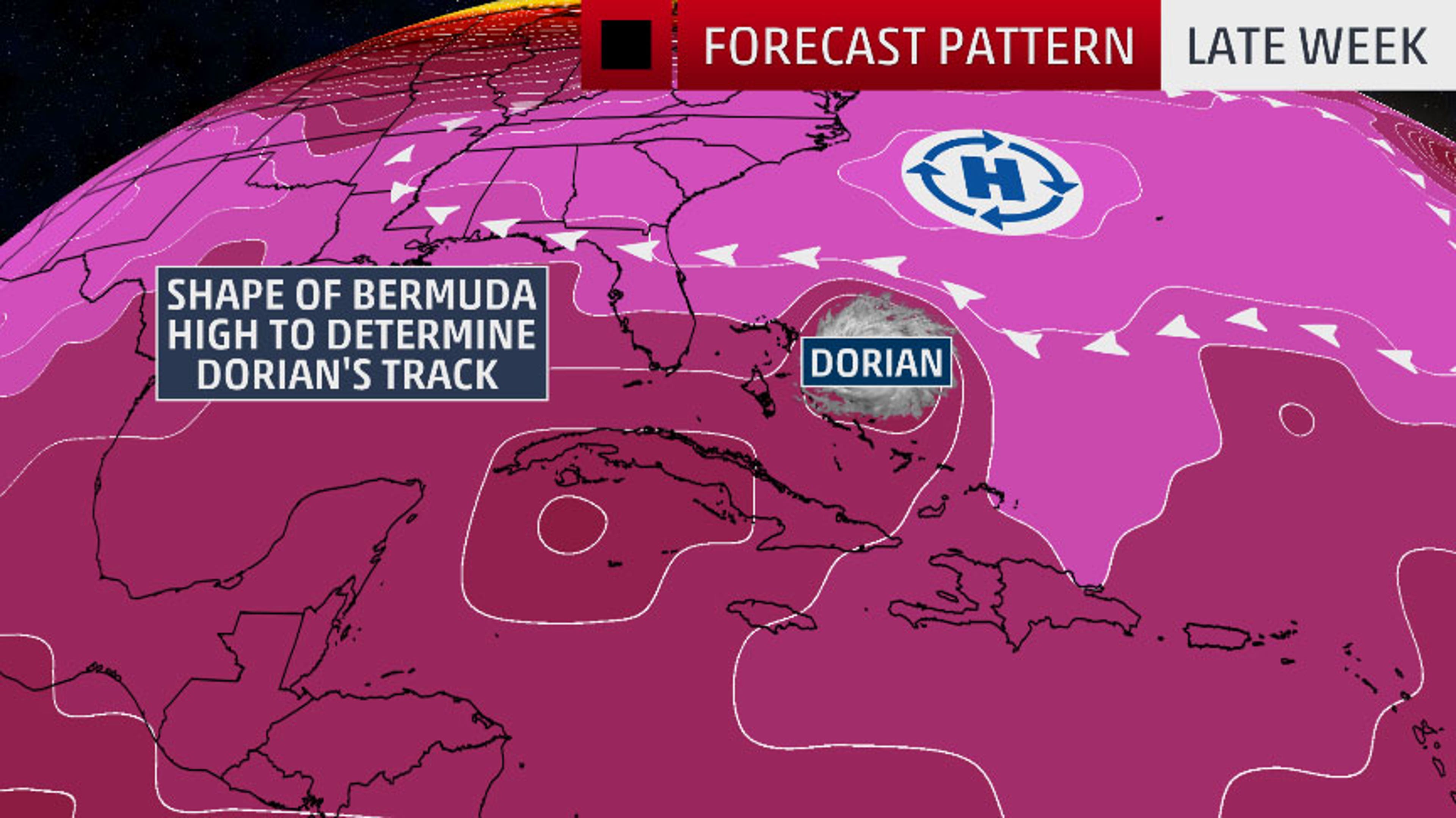 This is because high pressure, what meteorologists call the Bermuda high, is expected to strengthen between Bermuda and the southeastern U.S. This would steer Dorian toward the Bahamas and the east coast of Florida.
