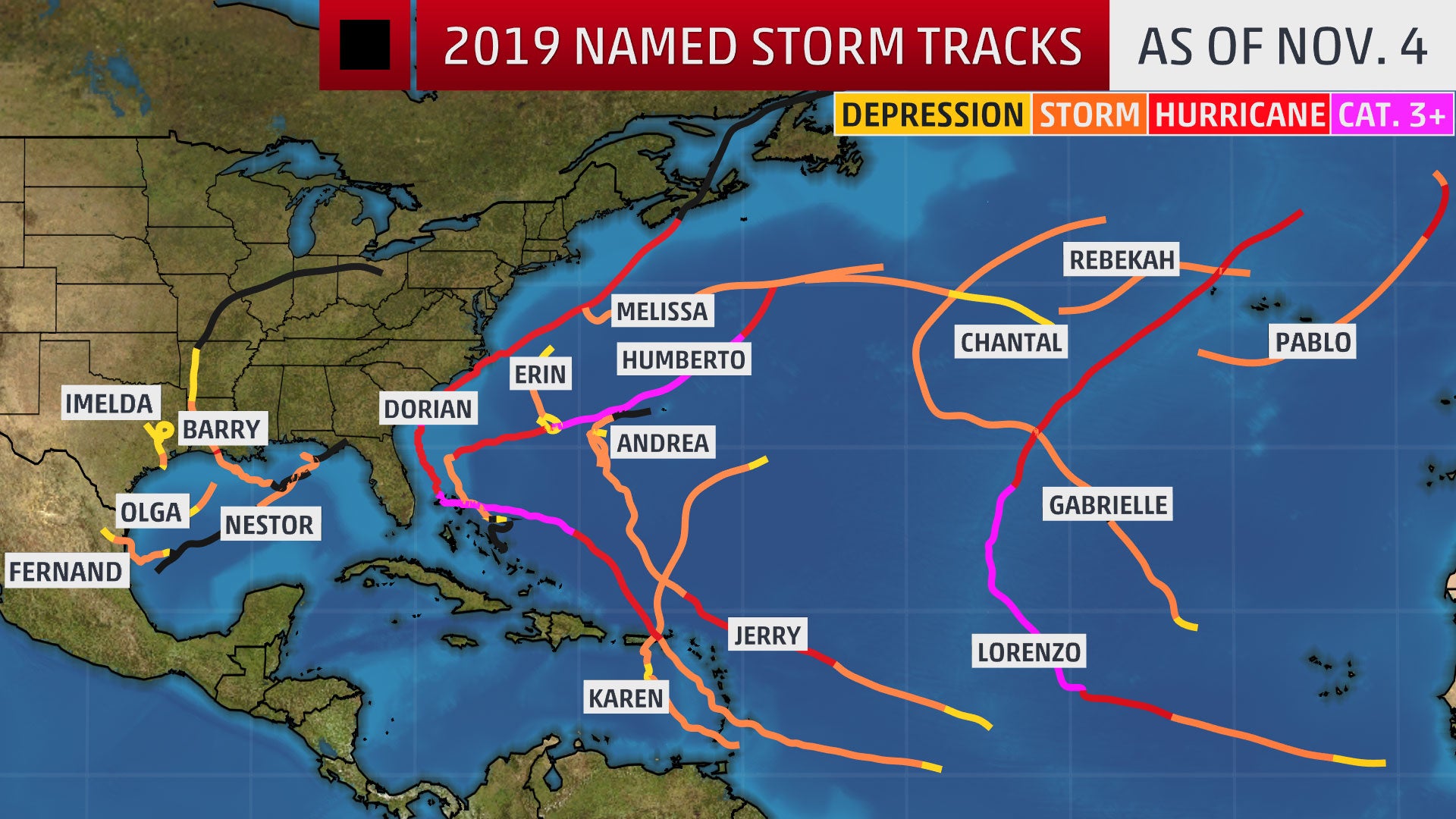 The tracks of the 17 named storms in 2019. Any storms with black line segments were not classified as a tropical cyclone during that portion of the path.