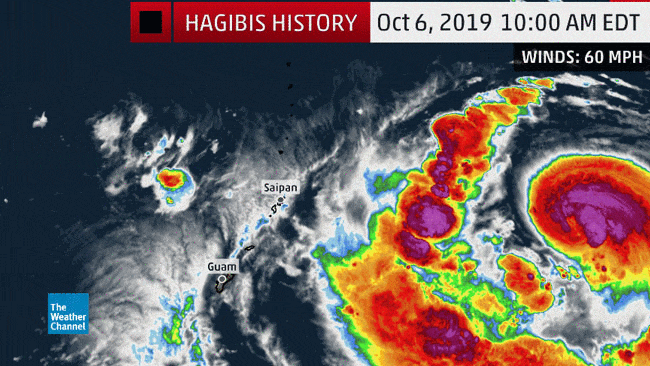 Infrared satellite loop and estimated maximum winds of Hagibis as it rapidly intensified from a tropical storm to a Category 5 super typhoon from October 6-7, 2019.