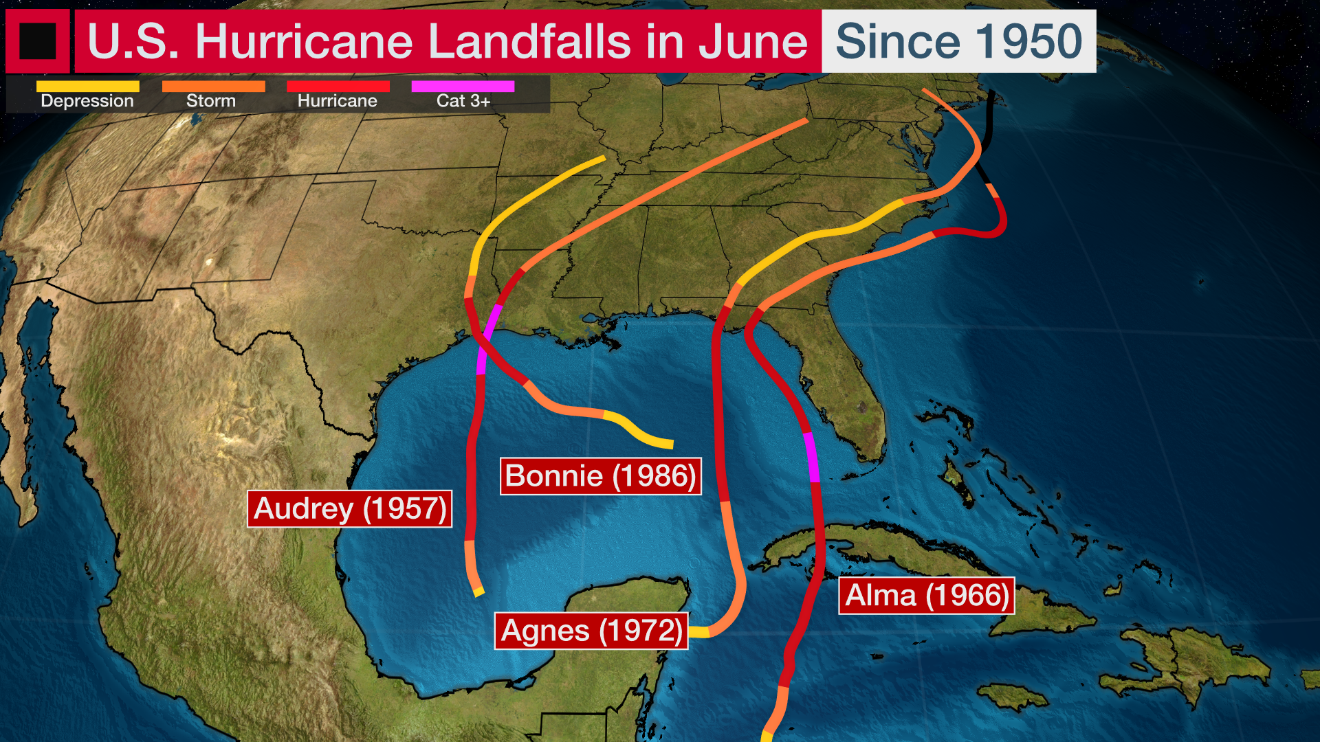 Agnes (1972), Alma (1966) and Audrey (1957) are the other three June U.S. hurricane landfalls since 1950.