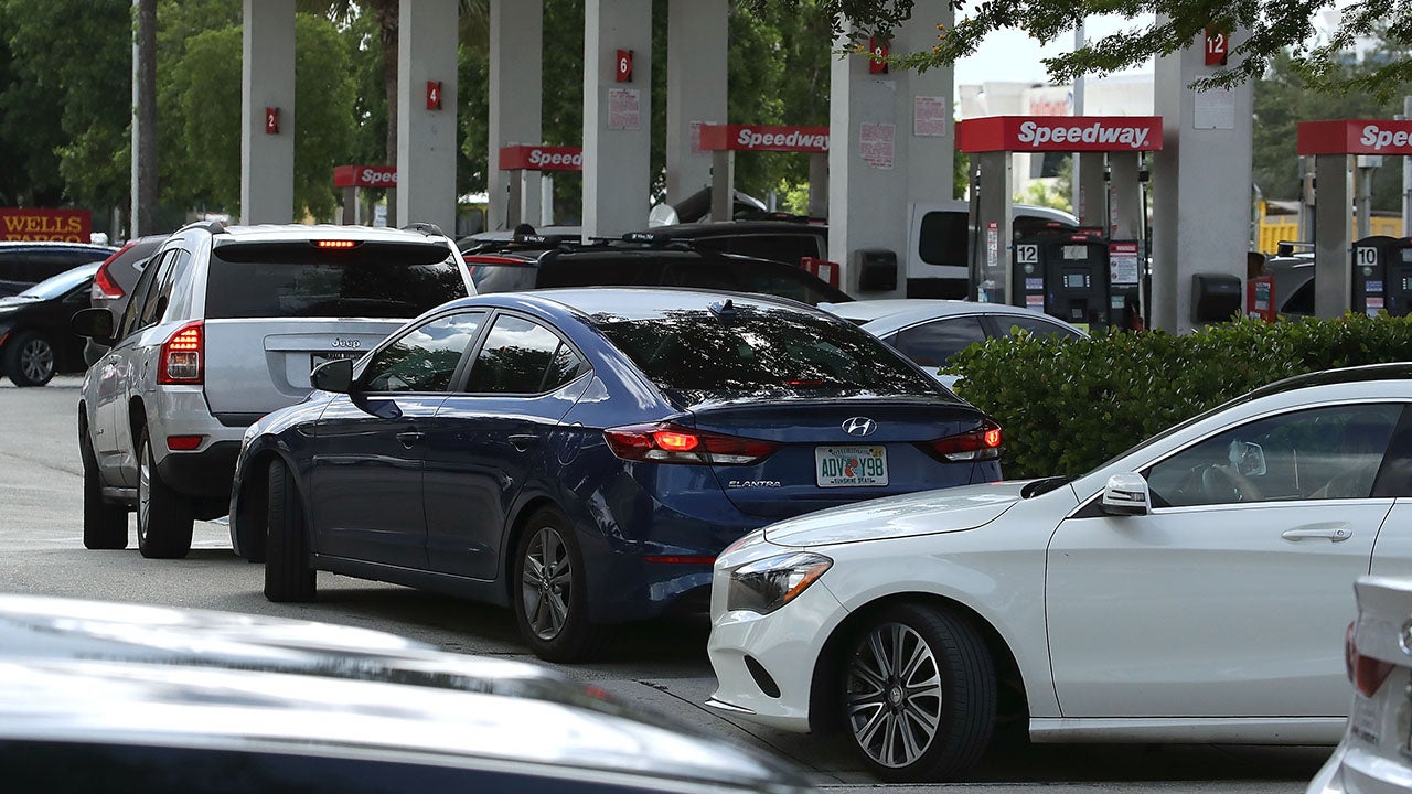 Vehicles are lined up at a gas station in hopes of getting gas to prepare for Hurricane Irma on September 6, 2017, in Doral, Florida.