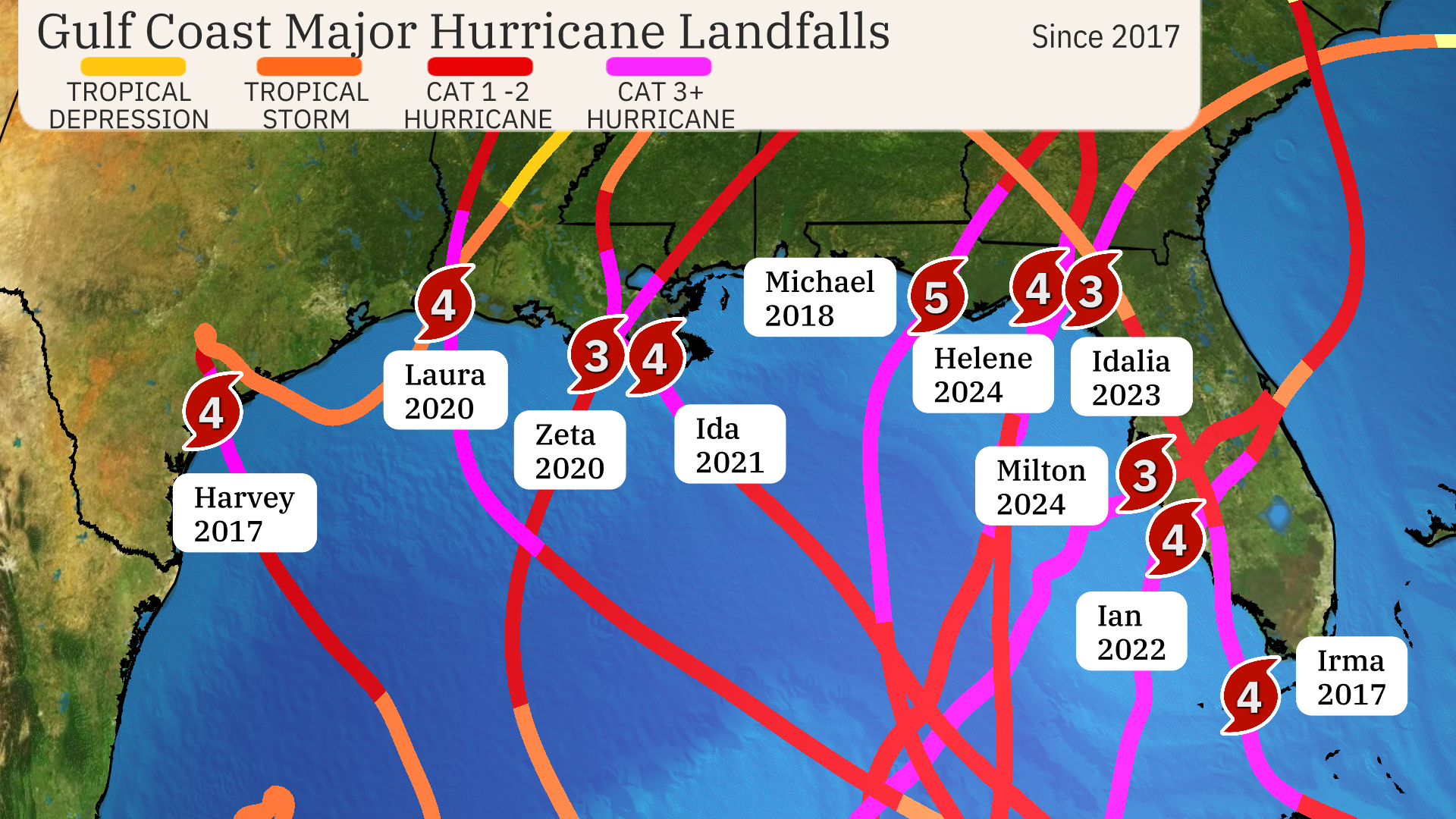 The d​estructive stretch of majors began with Harvey in 2017: The landfall of Harvey in Texas was followed by Irma in Florida that same year. After that came Michael in 2018, Laura and Zeta in 2020, Ida in 2021 and Ian in 2022. Idalia struck Florida last year as a Category 3 storm, then Helene and now Milton in 2024.