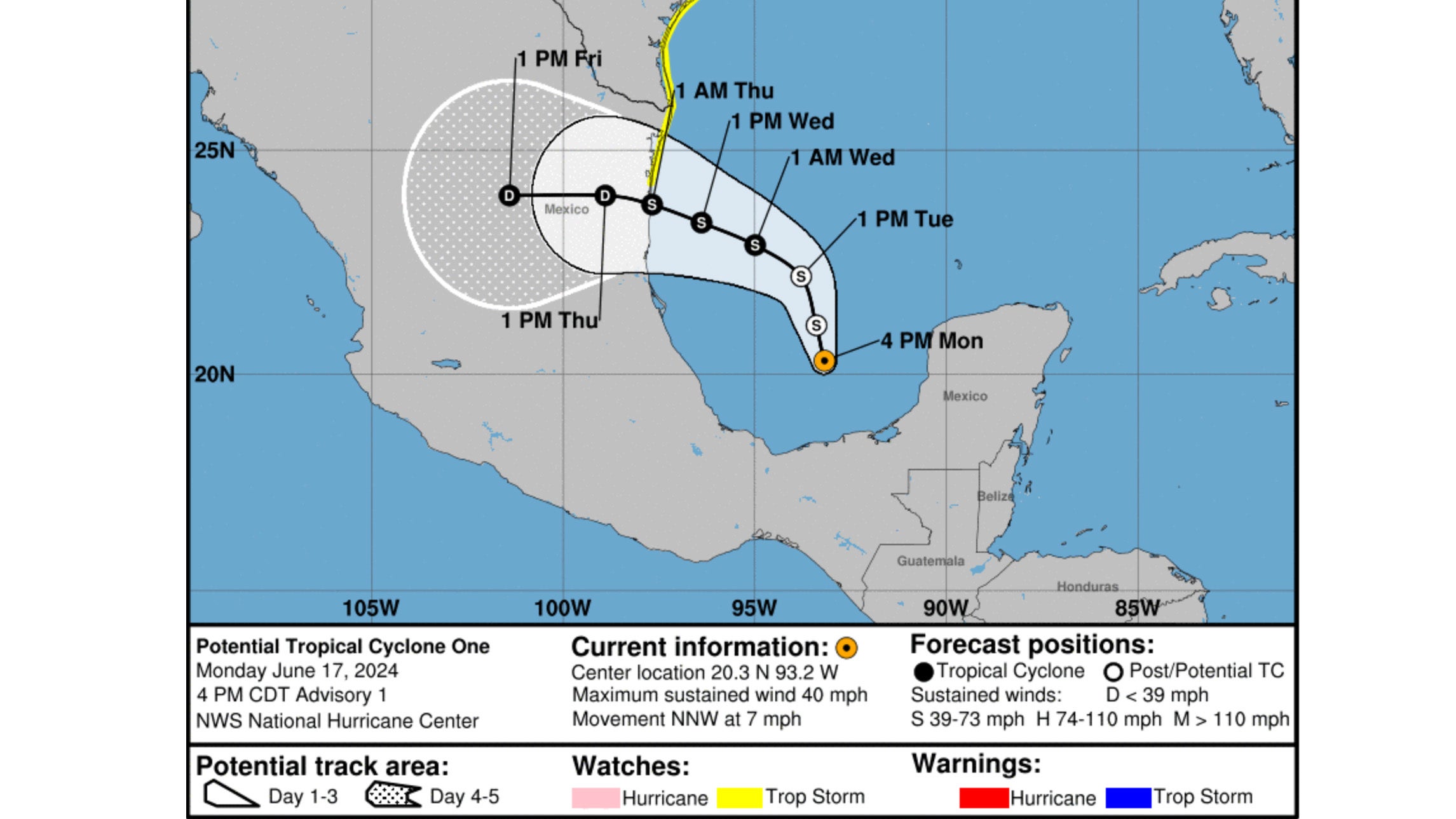 Forecast path and tropical storm warnings for Potential Tropical Cyclone One issued on June 17, 2024. This system went on to become Tropical Storm Alberto two days later.