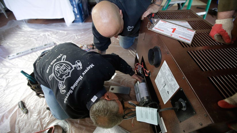 In this Nov. 20, 2014 file photo, David Mayer, owner of Mayer's Heating Service and plumber David Murphy, left, connect a new direct vent furnace into a house in East Wareham, Massachusetts.