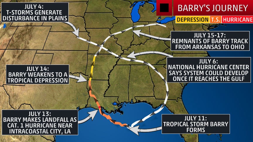 White lines show the track of the disturbance that eventually formed into Barry and the track of Barry's remnants after it dissipated.