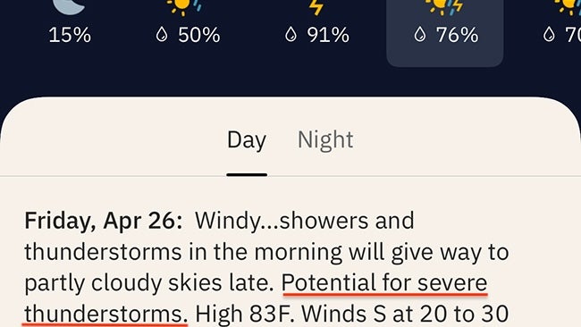 O​n The Weather Channel app, if you see a day with a lightning icon, tap on that day to get more forecast details and see if it mentions a "potential for severe thunderstorms."