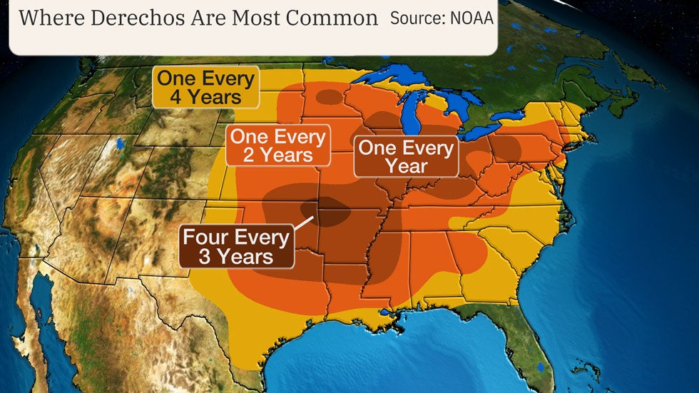 Reports of destructive, straight-line winds from severe thunderstorms hit an annual peak that we are in the midst of right now, sometimes coming in the form of a widespread wind event called a derecho.