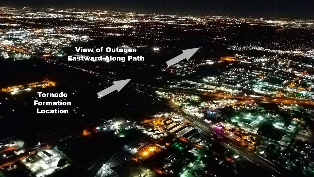 Since the tornado moved through an area with a large number of homes and businesses, the darkness from widespread power outages stands out from the brightly lit undamaged areas bordering the tornado's path. This nighttime power outage contrast would not be seen if the tornado had moved through a rural area with few structures.