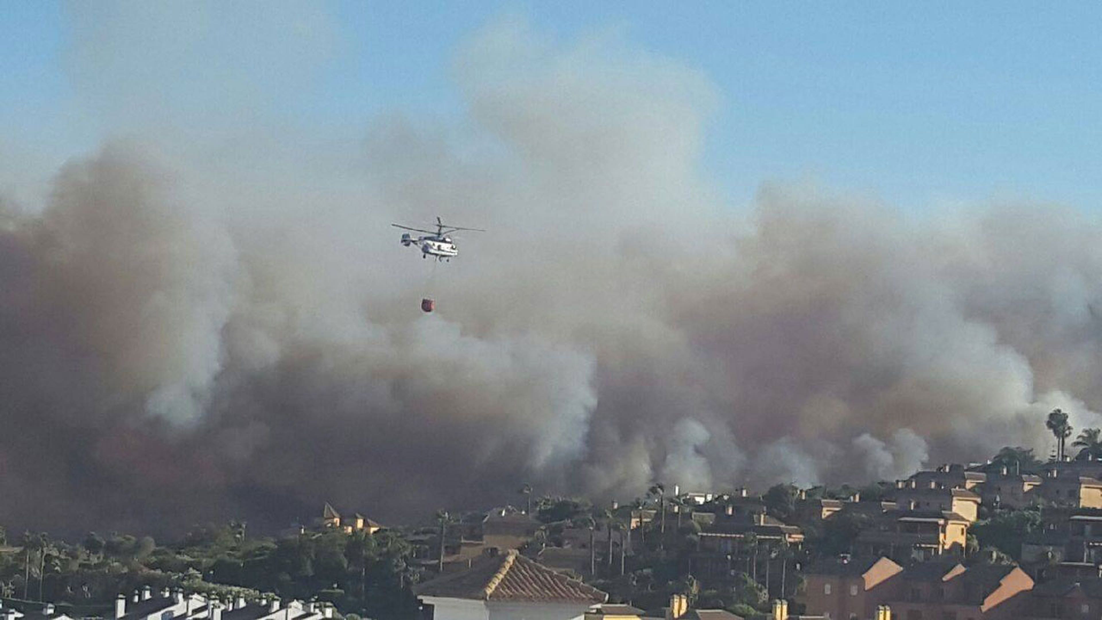 A helicopter carries water to dump on a fire in the province of Cadiz, Spain, on Tuesday, June 12, 2016. (Facebook/Larissa Miranda)