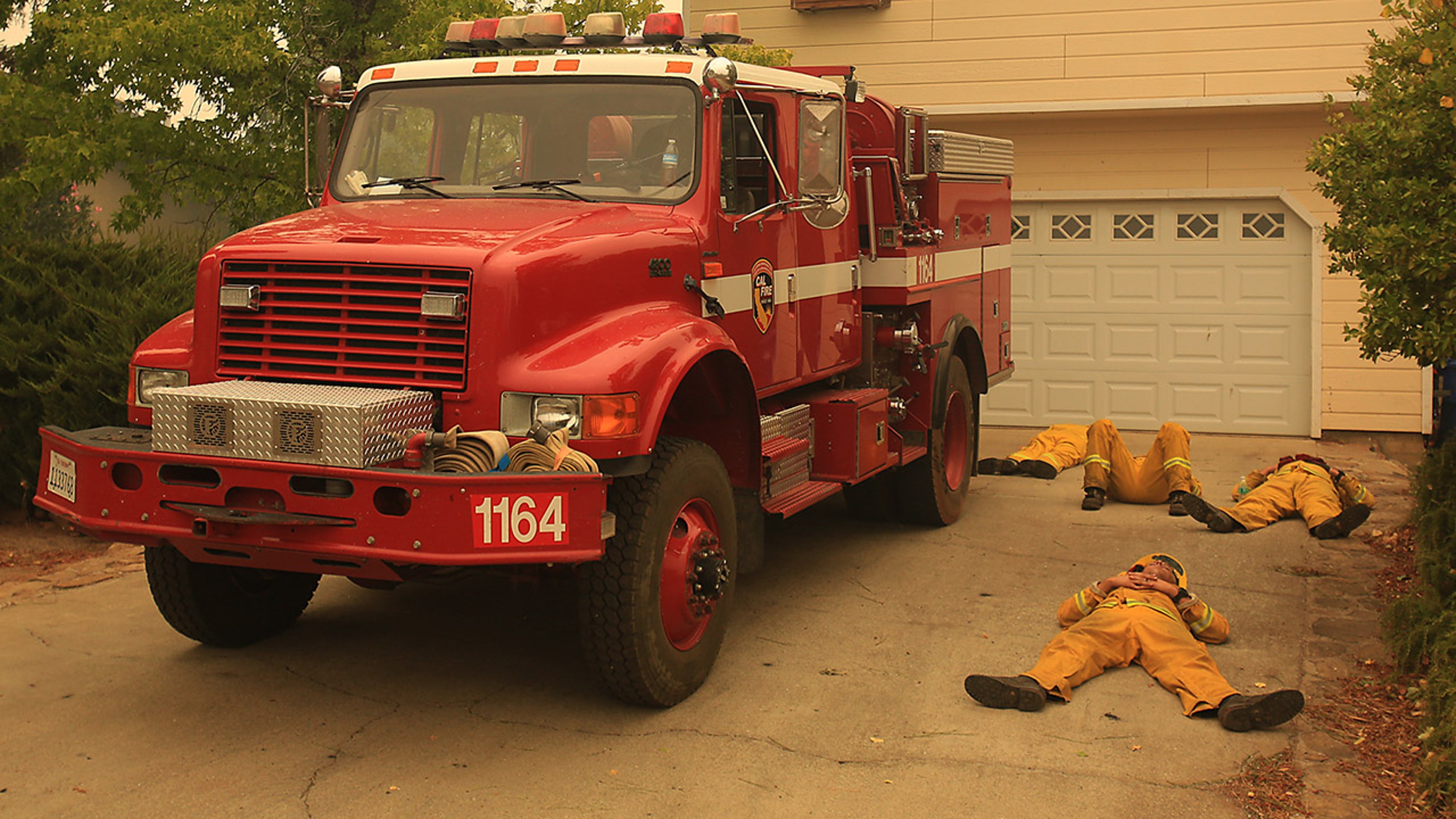 Mendocino County firefighters rest after defending homes in Hidden Valley Lake, Sunday, Sept. 13, 2015, in Lake County, Calif. Two of California's fastest-burning wildfires in decades overtook several Northern California towns, destroying homes and sending residents fleeing. (Kent Porter/The Press Democrat via AP)