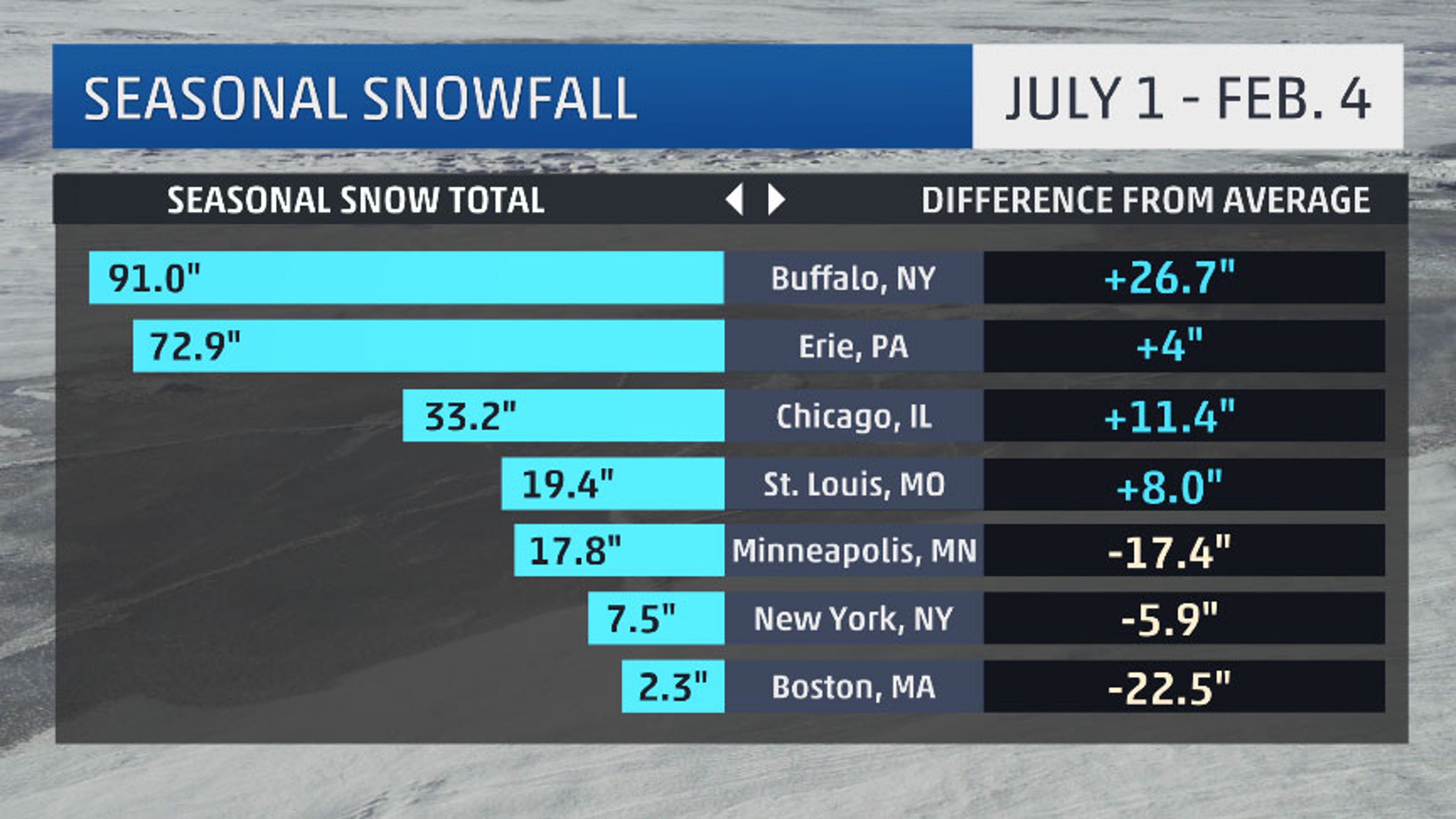 Buffalo, New York, has also experienced above-average snowfall with 91 inches of snowfall piling up. Not all areas near the eastern Great Lakes have seen above-average snowfall. Cleveland and Syracuse, New York, are both more than 10 inches below average for the season.