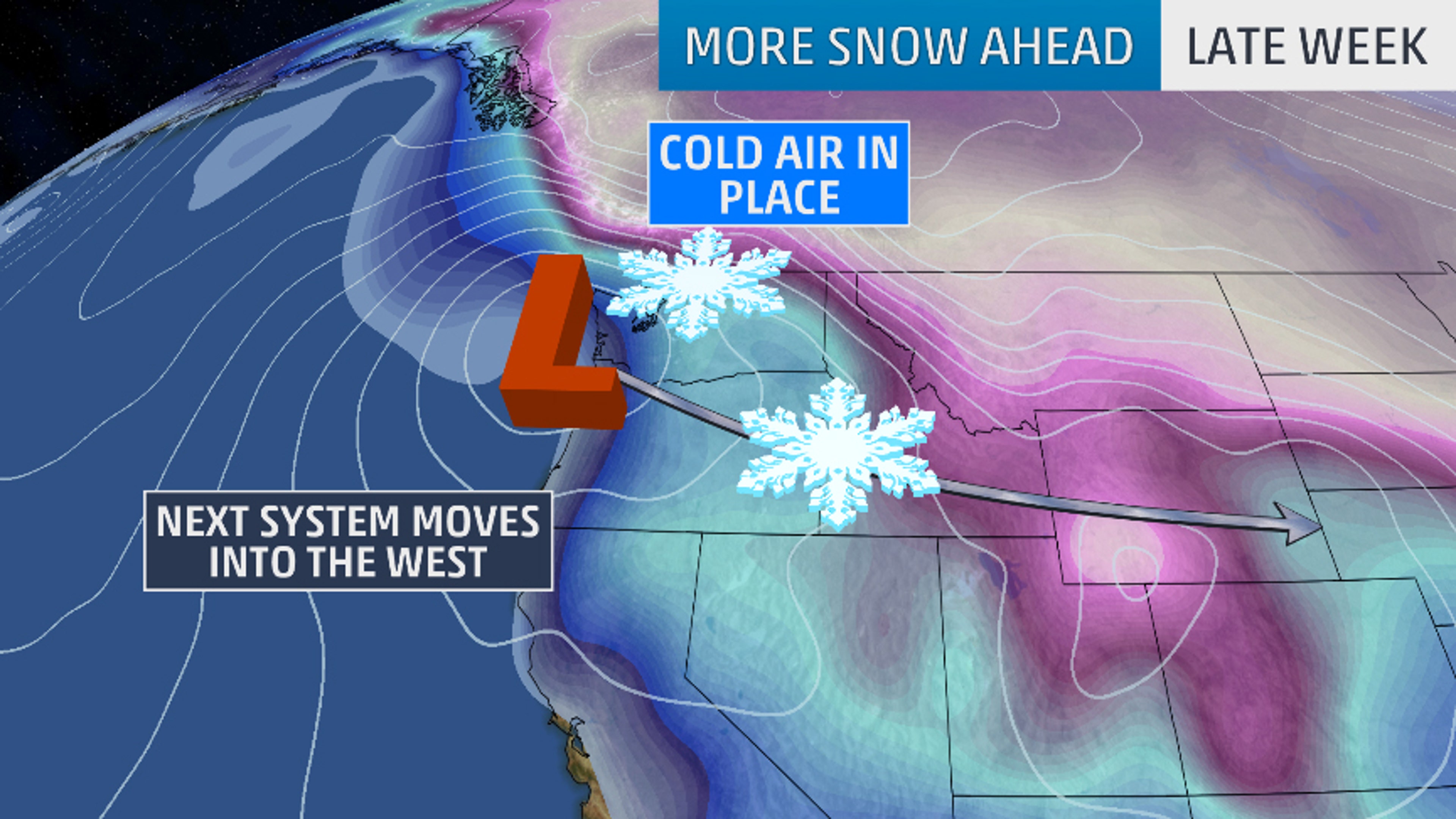 This colder pattern is expected to remain in place in the West into much of next week, with potentially more rounds of low-elevation snow.