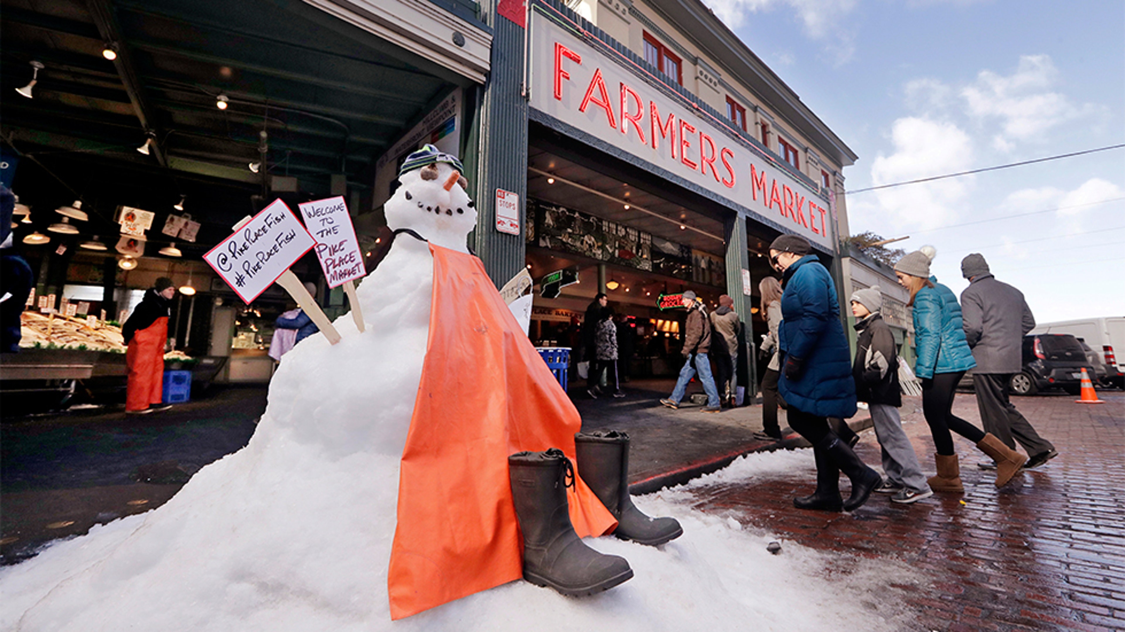 A snow sculpture is dressed as the fish mongers working behind as people walk into the Pike Place Market in near-freezing weather Tuesday, Feb. 5, 2019, in Seattle. Winter weather closed schools and disrupted travel across much of the West, with ice and snow stretching from Seattle to Arizona.