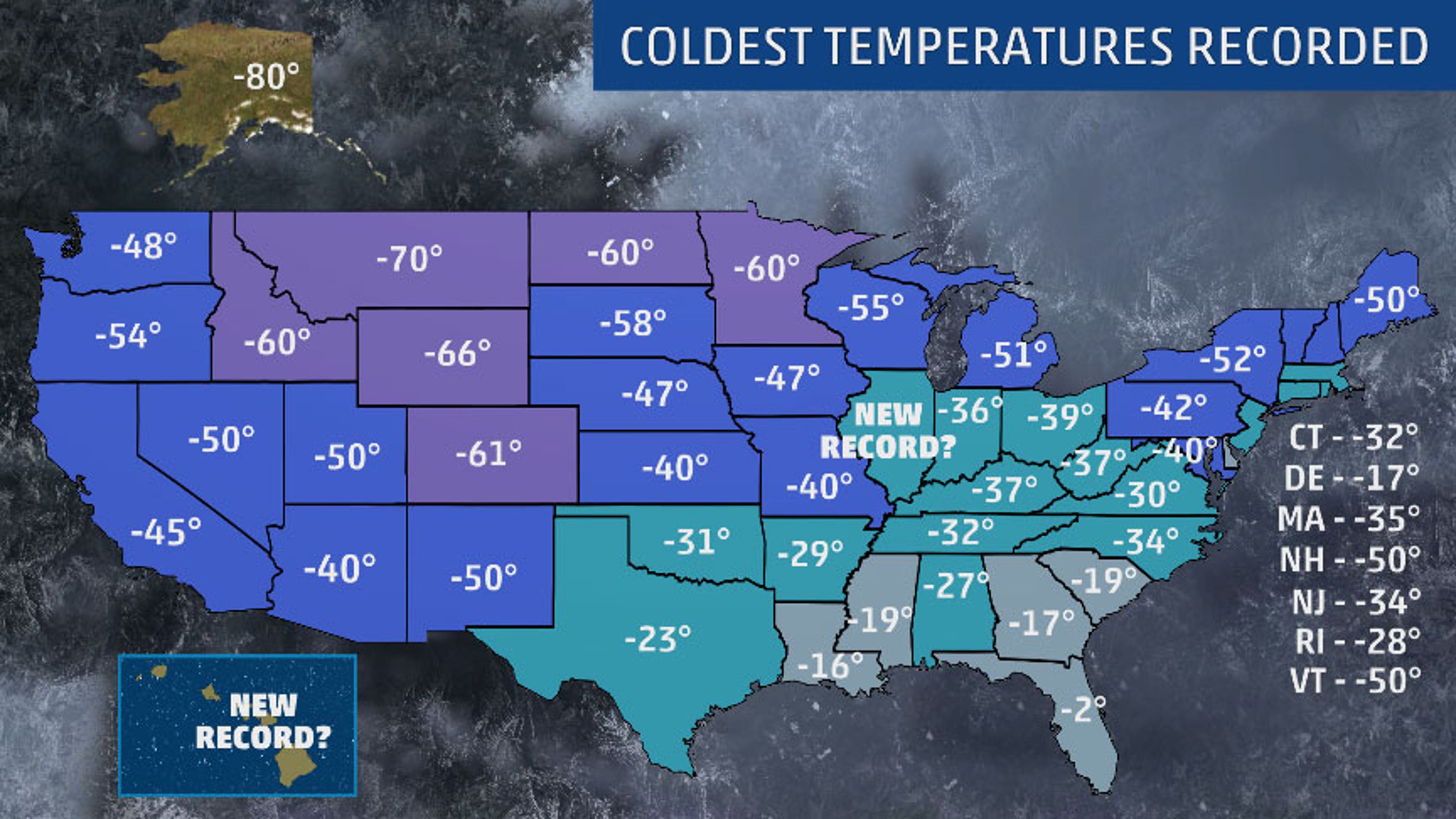 The map above indicates the coldest temperature ever recorded in all 50 states, according to the National Oceanic and Atmospheric Administration (NOAA), with the exceptions of Illinois and Hawaii, which may have recently broken their all-time record cold temperature.