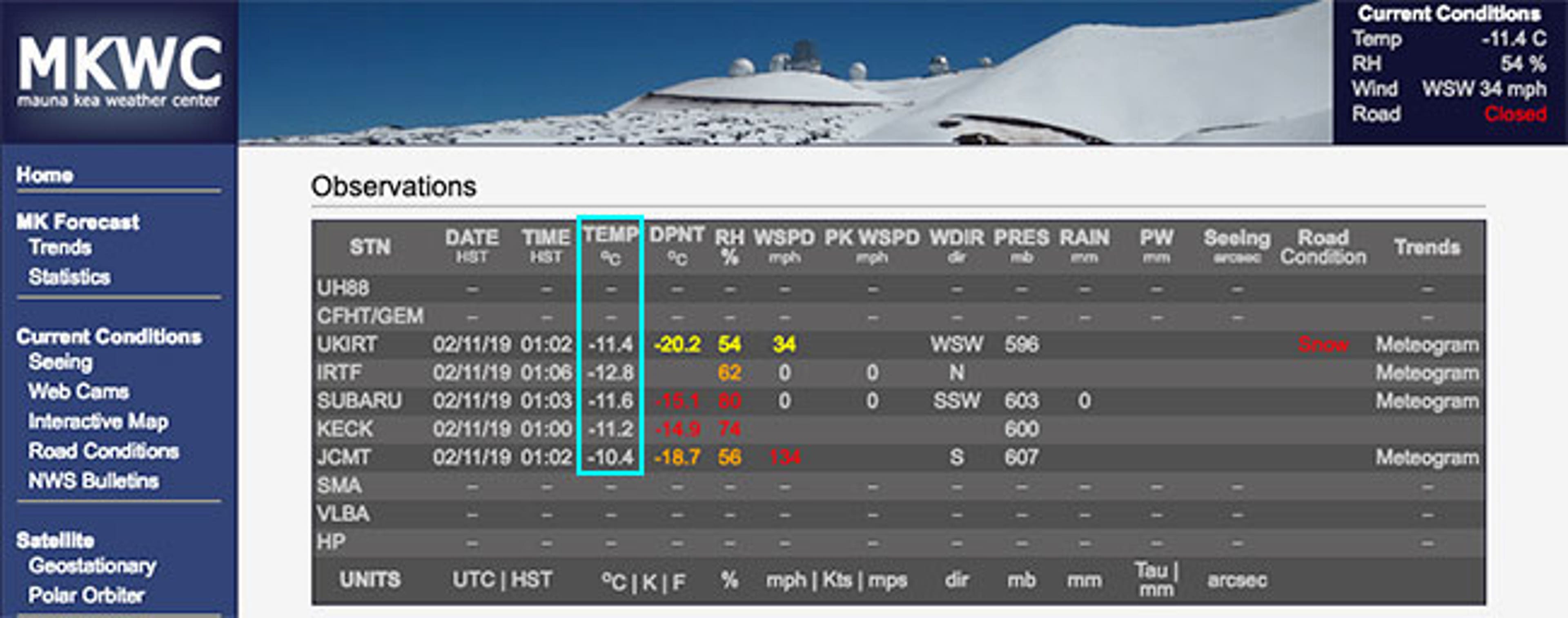 A screengrab of temperatures atop Mauna Kea, Hawaii, just after 1 a.m. HST, Feb. 11, 2019.